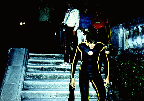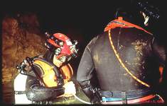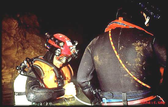 NEMAUSA XII - Au cours de l'année 1990, la faisabilité d'une nouvelle exploration par pompage et plongée est mise à l'étude. La décision est prise fin 1990 et l'expédition Nemausa XII est programmée du 15 août au 15 septembre 1991. Elle débutera le 13 août de cette même année. Quelques nouveautés importantes sont mise en oeuvre au cours de cette expédition. Tout d'abord le transport des pompes, par les plongeurs, dans les galeries inondées pour les mettre en attente dans les zones stratégiques. Ensuite la puissance du matériel de pompage par rapport aux précédentes expéditions, et le synchronisme avec les travaux de plongée. Enfin, l'infrastructure de surface où les spéléologues pouvaient se restaurer et se reposer sur place. Il ne faudra que quelques jours pour assécher le réseau jusqu'au siphon 1970 (1000 m3 en début de pompage).