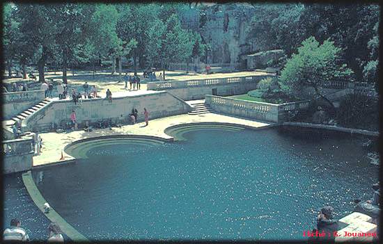 En plein coeur de la ville de Nîmes, de nombreux panneaux indiquent les jardins de la Fontaine. La vasque, bordée d'hémicycles antiques, sied au
