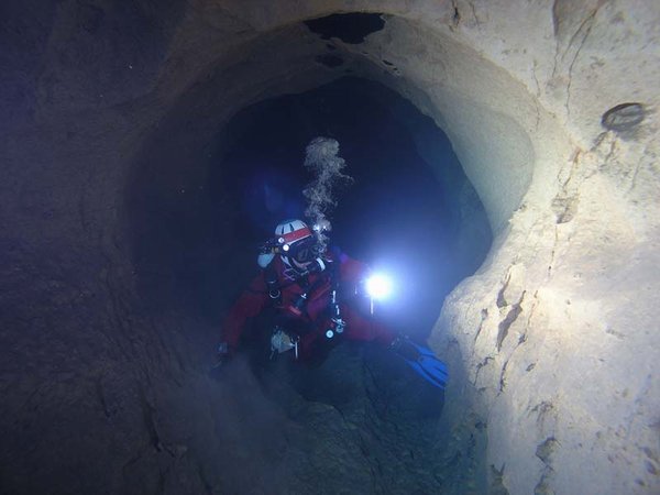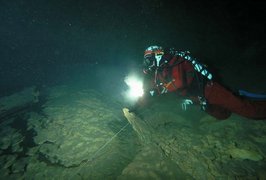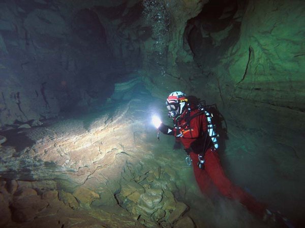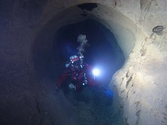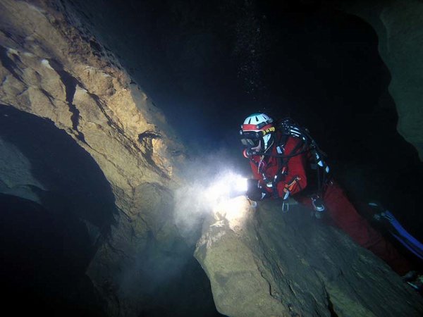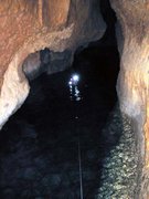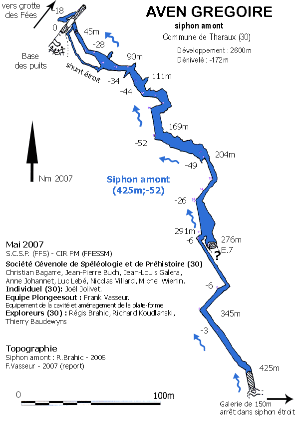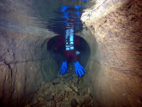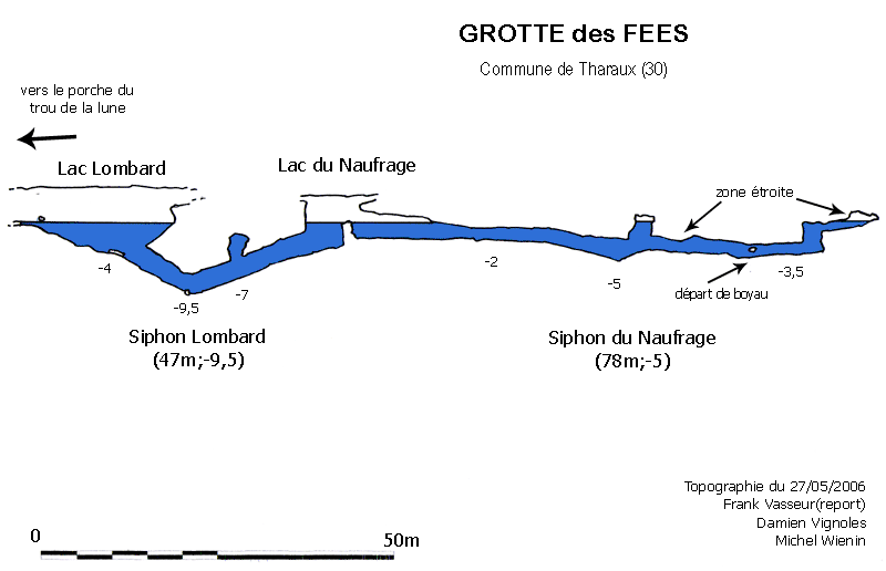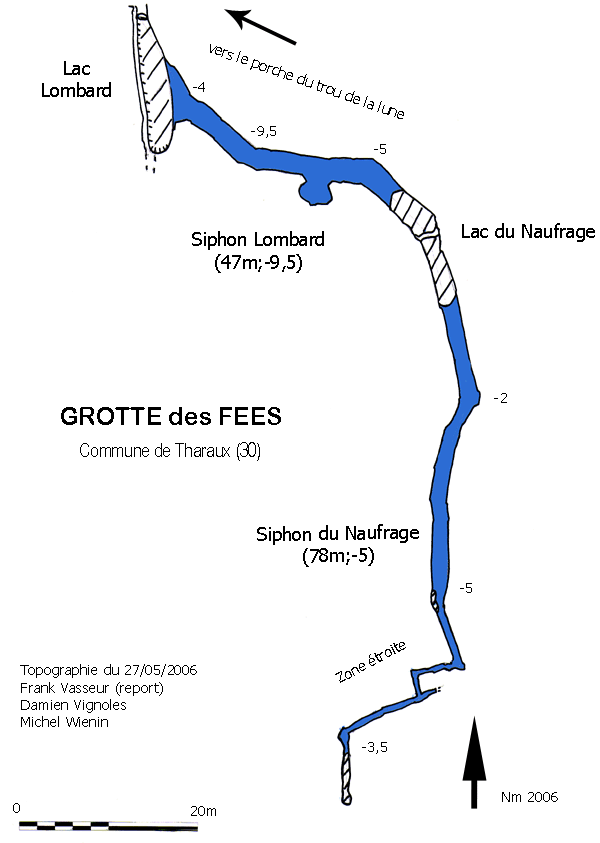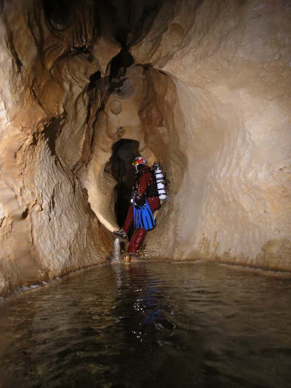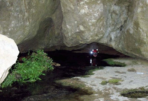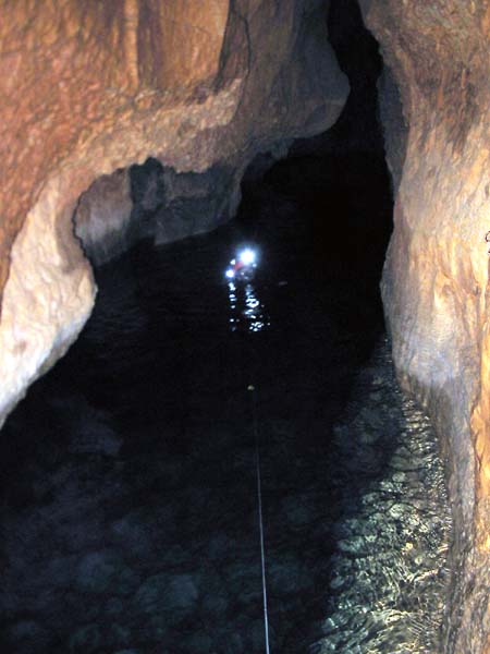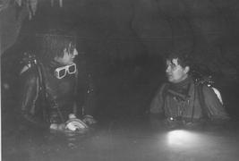 Gil Veyssière et Philippe Nouza dans le lac d'été de la grotte des Fées (30) le 31-01-1982