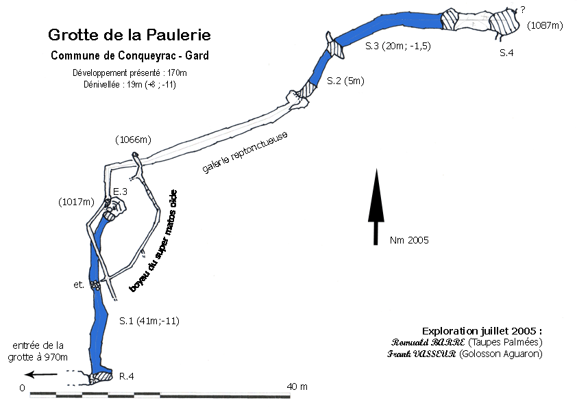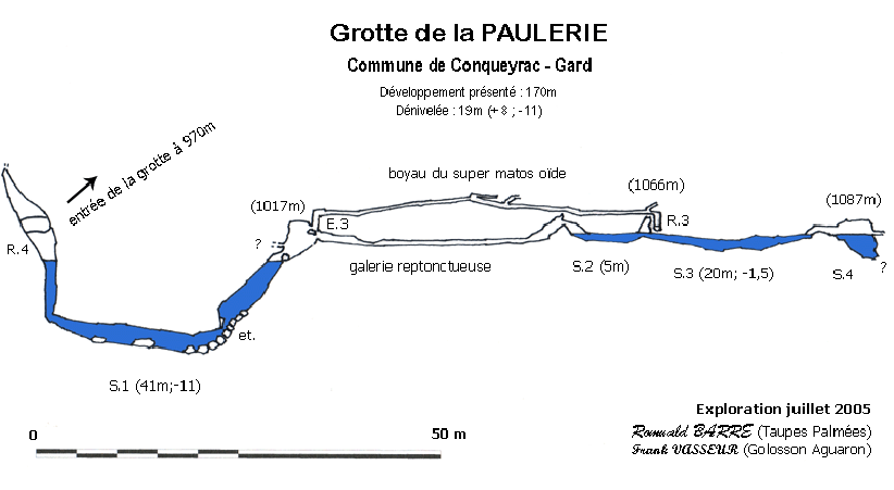 Au début des années 2000, Damien Vignoles plonge le siphon en inspectant l’extrémité amont de la fracture. Les Taupes Palmées (30) découvrent plusieurs départs de galeries prometteurs qui totalisent 70m de développement.