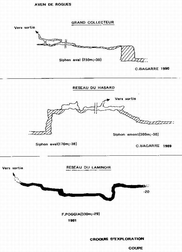 Les siphons de la galerie du laminoir (-200) à 1500m de l'entrée sont plongés par F.POGGIA en septembre 1980 puis le 25 Janvier 1981. Le S.1 est vu sur 95m, arrêt à -8, le S.2 sur 330m, arrêt sur trémie à -20 aprés un point bas à -29.