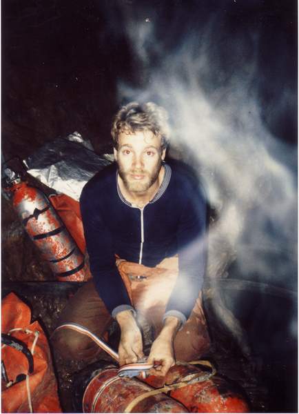 jean-charles Chouquet le 16 juillet 1988 devant le siphon aval de la rivière Aubaret (S28), par R. Villemejeanne |