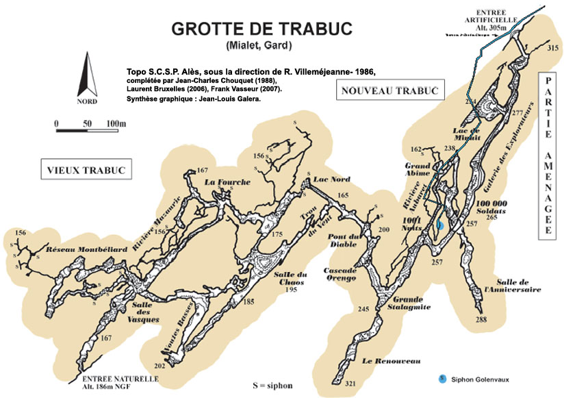 Historique Lundi 03/03/03, Michel Pauwels a replongé la grotte de Trabuc (30) pour topographier le S.13 et faire aussi quelques visées dans le nouveau siphon suivant la cloche, quil a sorti après environ 80 m. Derrière ça continue en galerie très basse et étroite où il na pas pu se déséquiper. Arrêt sur ras-le-bol, retour prévu avec un matos minimal. Au retour, il a suivi une galerie latérale en rive gauche à 20 m. du départ, pour retomber 10 m. plus loin sur un fil qui se terminait là dans une cloche, suivi sur une vingtaine de m. dans une galerie confortable. Vu l'orientation de la topo cela semble être une branche latérale du S14, qui démarre tout près du S13, ce qui pourrait donner un accès plus aisé à son terminus. Description Il fait 45 m. et donne accès à un petit bout de réseau exondé à l'extrémité duquel se trouve un nouveau siphon plongé sur +/- 50 m., arrêt sur une zone plus étroite mais il y a des possibilités à revoir... |