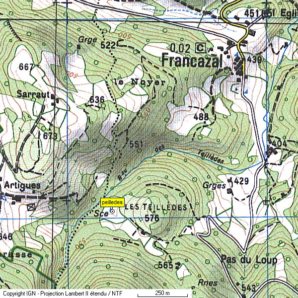 La route de Francazal(31) à Cazavet(09) par le hameau de Salège franchi le ruisseau des Teillèdes 500 mètres après avoir quitté Francazal. Se garer à cet endroit. Remonter à pied le ruisseau des Teillèdes (souvent à sec en été ) sur une cinquantaine de mètres. La grotte s'ouvre sur votre droite (donc en rive gauche) au pied d'une petite falaise.