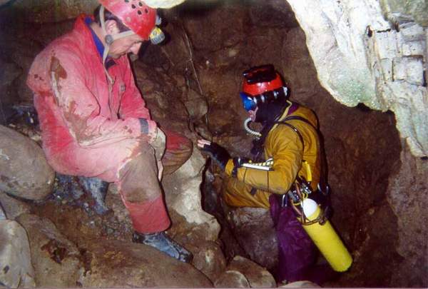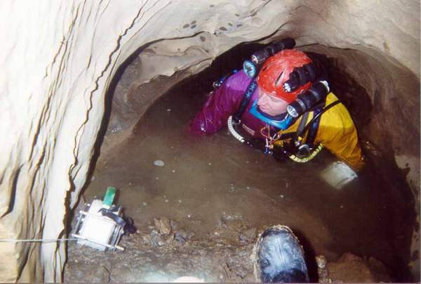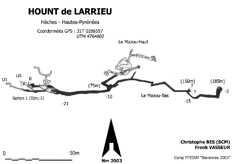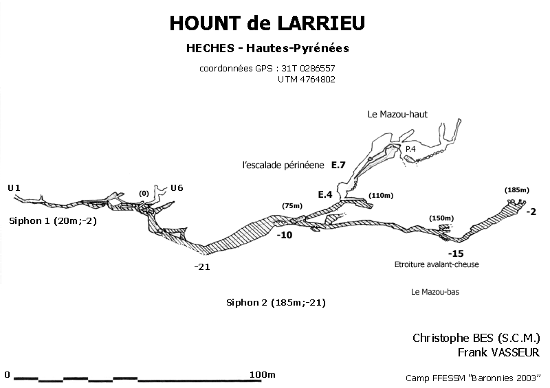 le siphon sur 50m et sort une branche latérale à 100m du départ . Tentative infructueuse de pompage en fin juillet 2001 à cause du niveau de la Neste exceptionnellement élevé pour cette période cette année-là Plongée à lautomne 2002 et en juillet 2003 de Frank Vasseur, avec Damien Vignoles la seconde fois (camp FFESSM) qui permetttent lexploration duMazou-haut (galeries exondées à partir de la branche latérale dans le siphon) et de prolonger le mazou-bas (siphon) jusquà 185m. . |