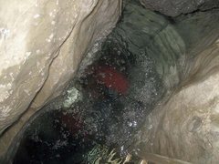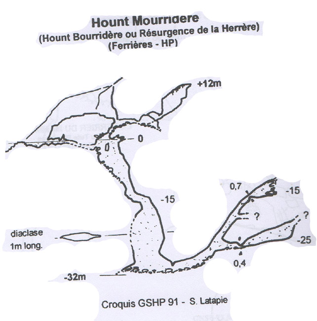 Historique Première plongée par Bertrand, Hoenraet (Belge) 89 repris en 91 par le GSHP et GS Gaves, , O. Gaspé & S. Latapie à poursuivre. Siphon de -32, arrêt sur galerie étroites ascendantes.