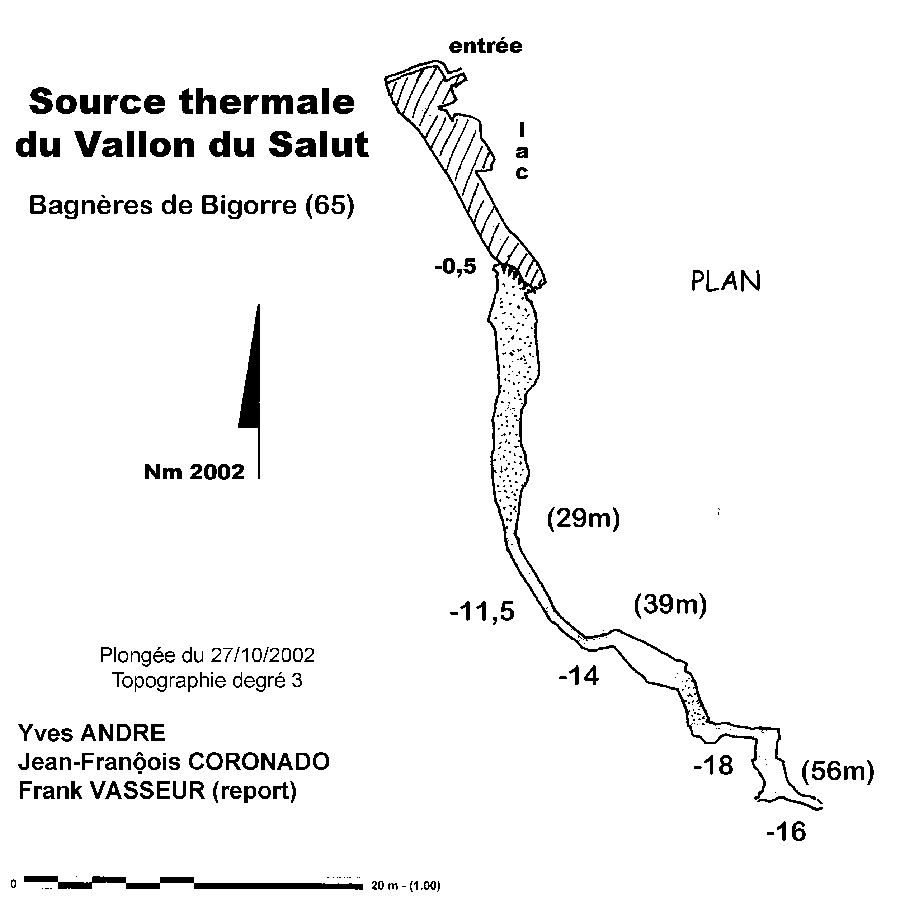 Le bassin d'entrée est prolongé par un lac qui domine un puits noyé. On plonge à -5 dans une fracture large, qui glisse plein sud le long d'un talus sableux jusqu'à -11.