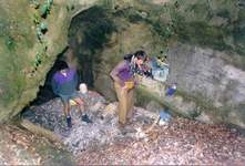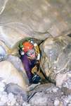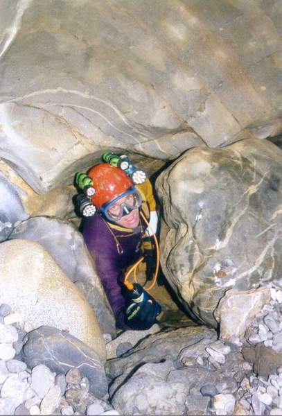 Une étroiture entre des blocs accolés à la paroi débouche sur un plan deau limpide. La galerie (2 x 2m) plonge à 4 à 10m du départ, le long dune pente de blocs et galets, dont certains de granit.