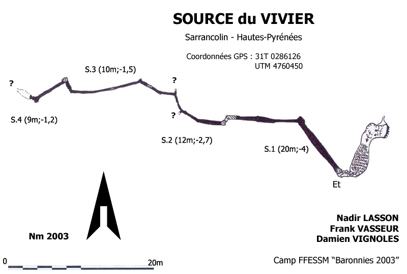 A 4, le conduit se réduit en un étroit boyau horizontal. Quatre mètres plus loin, la galerie sélargit en conservant une hauteur réduite. On remonte ce laminoir incliné jusquà 2m où un nouveau boyau, plus étroit encore débouche dans une cloche affectée dun seuil rocheux ponctuel qui rejoint la vasque du S.2 (12m ;-3) puis galerie de 5m S.3 (10m ; -1,5) et progression de 8m (-2) dans le S.4 arrêt sur une étroiture sérieuse avec vue sur le miroir de sortie.