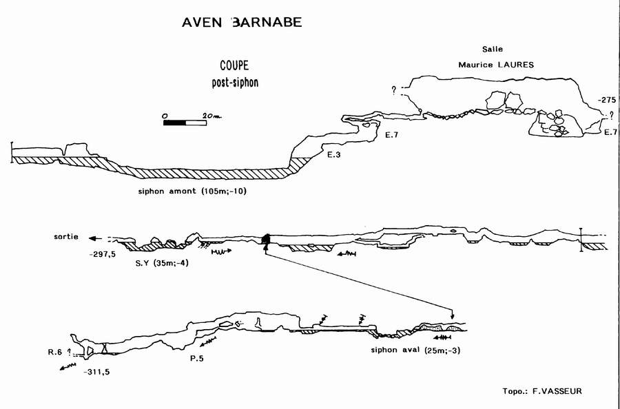 A -297,5 le siphon Y (35m;-4) plonge à -4m. La galerie (3x4m) s'engage