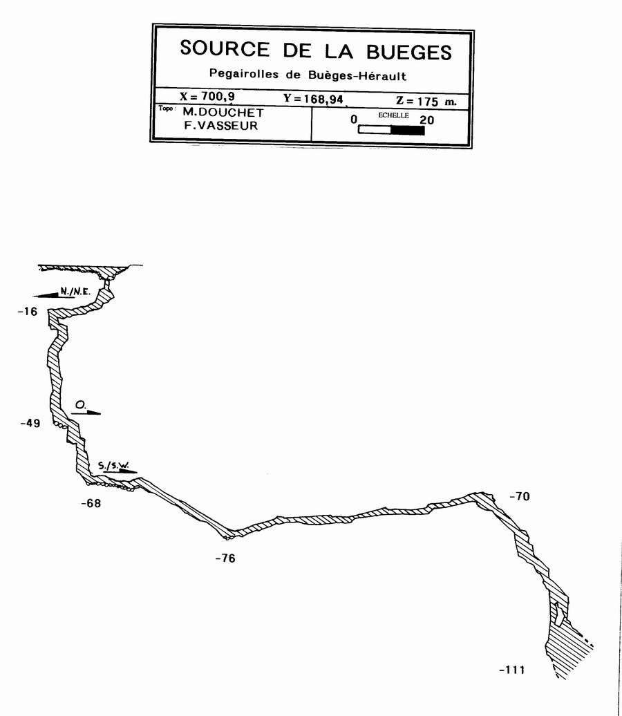 Dans le fond de la vasque, à -3, une étroiture verticale devait être franchie en décapelé pour accéder, à -10 à une jolie fracture plus confortable. Un bref tronçon de galerie horizontale conduit à la lèvre d'une fracture verticale, qui plonge quasi-verticalement jusqu'à -50. Deux légers décrochements successifs renvoient à -68. Une modeste galerie déclive au sol de galets roulés atteint -76 avant de remonter sensiblement. Puis le conduit plonge à nouveau, présentant toujours de faibles dimensions (1 à 2m de large) jusqu'à une fracture étriquée explorée jusqu'à -111.