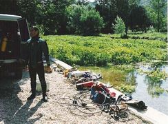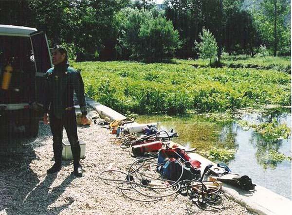 Edouard-Alfred MARTEL parlait avec emphase de cette majestueuse exsurgence. Tenaillés de longue date par ce projet, Jérôme DERIJARD (G.R.A.S.M.) et Eric PUECH (G.E.R.S.A.M.) se lancent en 1994 dans une laborieuse désobstruction au fond de la vasque. En trois séances, le passage est ouvert et la côte -76 est atteinte. Devant l'ampleur de la cavité, la main est passée au C.R.P.S. (13) dont Marc DOUCHET descend à -100, puis -111 lors d'une ultime pointe en mars 1995.