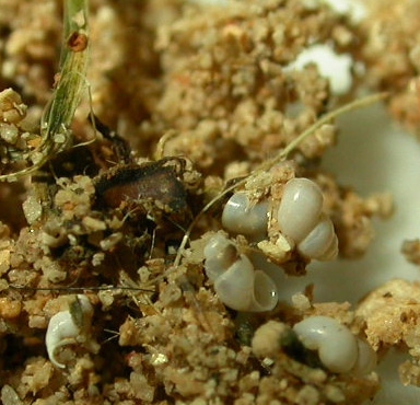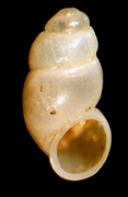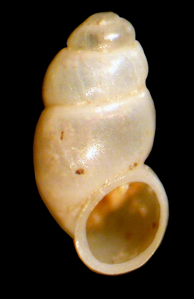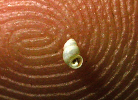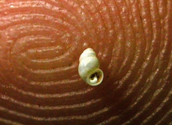 Belgrandiella saxatilis est une des plus petites espèces de la famille des Hydrobiidae. Une coquille de juvénile est visible sur cette photo, coincée dans l'ouverture de l'adulte.