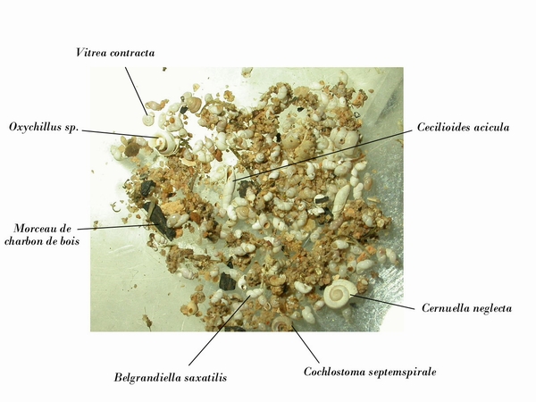 Onze espèces sont terrestres et leur présence dans les sédiments résulte vraisemblablement du drainage des eaux de surface : les coquilles sont usées, parfois cassées… La plupart sont des juvéniles ou des fragments de coquilles. Ces espèces sont toutes communes dans les milieux de pente des gorges et sur les causses.