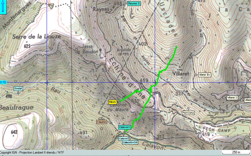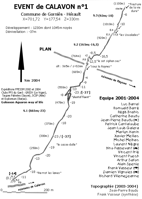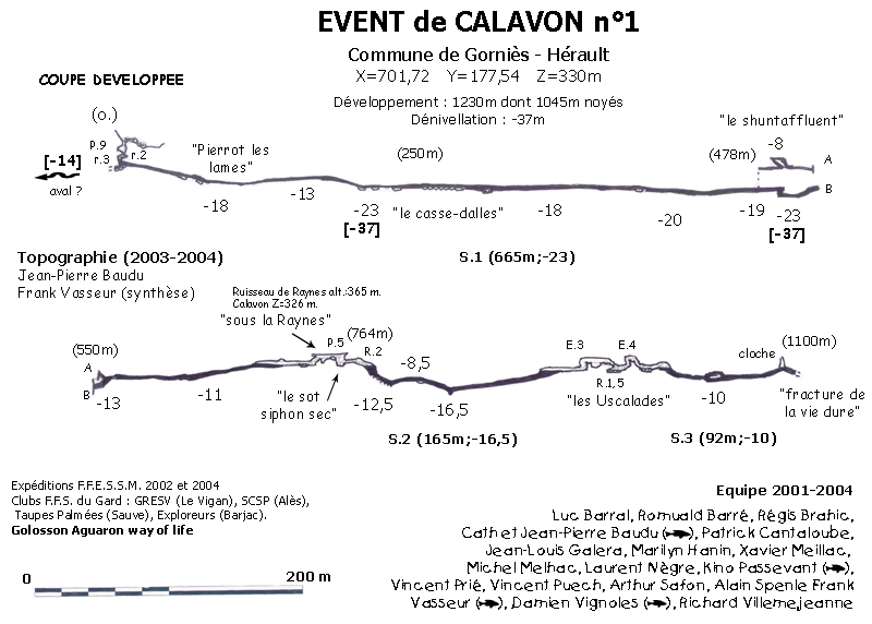 Le 14/08/1995, E.PUECH et C.MORE (C.R.P.S.) portent le terminus à 570m (-10) après un carrefour. Le lendemain, D.BARAILLE rajoute 210m à partir de son terminus précédent et sort le siphon. Il bute sur un ressaut après une brève galerie exondée.