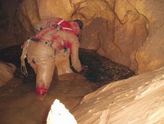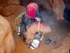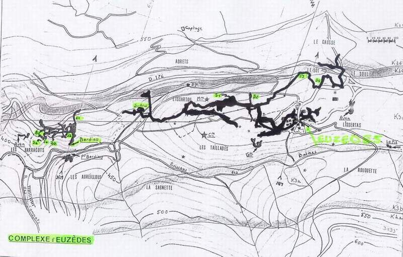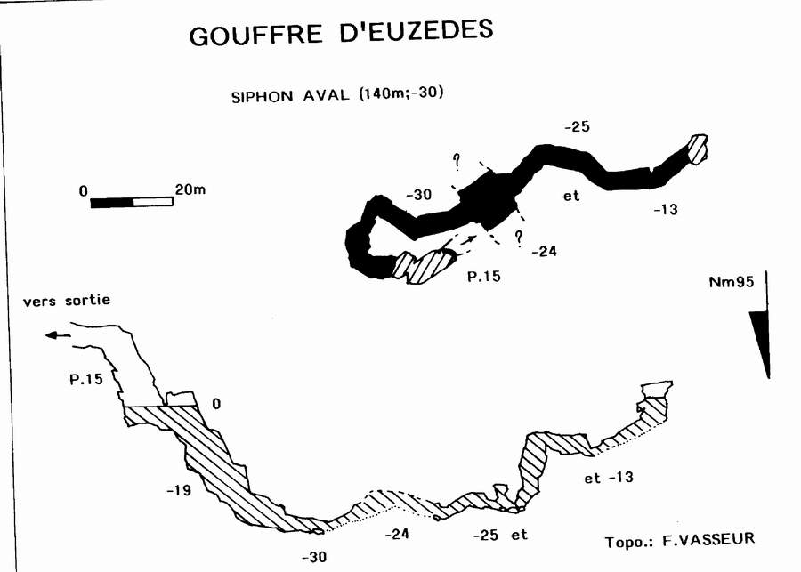 Vers l'aval, la galerie serpente un temps entre des monticules d'argile avant d'emprunter un parcours varié ponctué de siphons de sable, étroitures, ressauts et vastes volumes jusqu'au puits terminal baigné par la vasque du siphon. La mise à l'eau s'effectue sur descendeur (puits terminal de 15m) dans un vaste plan d'eau dont le niveau a baissé depuis la séance de topographie. A partir d'une vasque coalescente, un puits hélicoïdal plonge à -27 dans une galerie qui débouche, après un point bas à -30, dans un volume noyé occupé par une dune de sable (-25). En gardant le cap sur l'axe majeur du gouffre, une modeste galerie remonte, après désobstruction d'une étroiture, pour émerger dans une cloche (h=3m) sans continuation. Après examen de la topographie levée à cette occasion, il serait intéressant de reprendre les investigations au niveau de la salle dunée à -25, qui doit receler un passage vers la grotte du Berdiau voisine. Le siphon totalise 140m (-30).