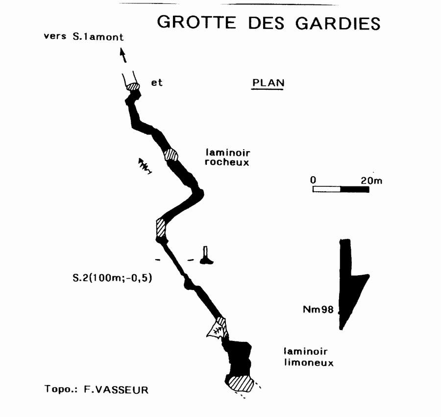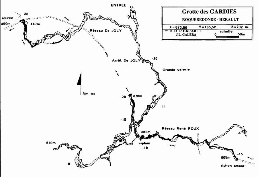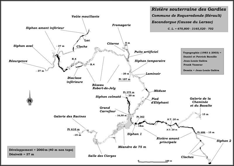 La première exploration qui nous soit parvenue est celle de Robert DE JOLY le 9 mai 1931. Il est stoppé à une centaine de mètres de l'entrée par un siphon temporaire. Un embranchement sur la droite lui permet de découvrir 350 mètres environ de galeries. La description qu'il en donne nous laisse penser qu'il n'avait pas atteint le terminus classique de cette galerie. Il semblerait qu'il se soit arrêté au niveau d'un effondrement de gros blocs, soit à une centaine de mètres avant le point 447 de la topographie présentée dans cet article. Le ruisseau souterrain dont il parle est vraisemblablement celui qui coule sur une trentaine de mètres au fond de la petite diaclase, et qui est situé au bas d'un ressaut vertical étroit qui s'ouvre à 300 mètres environ de l'entrée. En avril 1942, M. et Mme SEGUI faisant partie de la section spéléo du C.A.F. trouvent à sec le siphon qui avait arrêté Robert DE JOLY, et explorent au-delà la grande galerie jusqu'à la Salle des Cierges à 550 mètres de l'entrée ainsi que le ruisseau qui la recoupe sur une centaine de mètres. Dans la galerie DE JOLY, ils explorent, probablement en première sans le savoir, les cent derniers mètres dans une belle galerie jusqu'au point 447 m et un peut au-delà jusqu'au siphon aval. A la même époque, les Eclaireurs de Millau prétendent avoir porté le développement de la cavité à 2000 mètres. Il semblerait qu'ils aient ignoré l'exploration du C.A.F. quelques années auparavant. Le développement total de la grotte était à cette époque de 1300 mètres. - 1983 : au cours d'une conversation avec René ROUX du G.E.R.S.A.M., celui-ci me parla d'un siphon amont qui restait à plonger. C'est donc en compagnie de deux copains Daniel BARAILLE et Pierre KIRN, que nous décidons de reprendre l'exploration de la cavité avec l'accord des responsables de la Communauté de l'ARCHE. - Le 9 août 1983 ; Aucun de nous ne connaît la cavité. Portage des bouteilles jusqu'au siphon amont et plongée de celui-ci qui ne fait que 6 mètres de long pour une profondeur de 2 mètres. Au-delà, Daniel BARAILLE explore 250 mètres de belles galeries et s'arrête sur un nouveau siphon à 606 mètres de l'entrée. - Le 17 août et le 1 ier septembre de la même année Daniel et moi, levons 850 mètres de topographie dans l'ancien réseau. - Le 4 septembre, Patrick BARAILLE et moi-même topographions la galerie DE JOLY sur 370 mètres jusqu'au siphon terminal. - Septembre 83. Topographie du réseau amont reconnu le 9.08.83 par Daniel BARAILLE et découverte d'une galerie latérale explorée sur 132 mètres se terminant sur une importante cheminée qui doit communiquer avec la surface. Deux départs latéraux reconnus sur une longueur de 20 mètres chacun, n'on pas été topographiés et restent à explorer. Plongeurs : Patrick et Daniel BARAILLE et Jean-Louis GALERA. - Le 9 août 84, Daniel BARAILLE plonge le siphon aval de la galerie DE JOLY qui ne fait que 10 mètres de longueur pour une faible profondeur et ressort après quelques dizaines de mètres de cheminement par la résurgence située sous la Ferme des GARDIES. Au retour, il plonge en apnée un autre siphon tout à fait inattendu et explore 170 mètres de galeries parcourues par ce qui semblait être une dérivation du ruisseau déjà connu mais qui à l'examen de la toute récente topographie pourrait être un affluent. Nous levons également la topographie de la petite diaclase parcourue par le ruisseau et marquant l'arrêt de Robert DE JOLY. - Le 16 septembre 84, Daniel et Patrick BARAILLE plongent le siphon terminal amont sur plus de 100 mètres de longueur. - Le 1er Septembre 1998, Frank VASSEUR reprend l'exploration du siphon mais butte sur un passage trop bas une vingtaine de mètres seulement après le terminus de 84. Au retour, Frank lève la topographie. - Avril 2003. Au cours d'une séance photo, je retourne au siphon aval et je peux constater que le nouveau captage a provoqué un relèvement très sensible du niveau de l'eau. - Le 13 mai 2003. Dernière visite de cette belle cavité dans le but de faire le relevé topo des deux siphons aval. Frank ne peut que confirmer la remontée des eaux et lève la topo dans les siphons aval et amont maintenant assez longs. Description