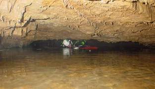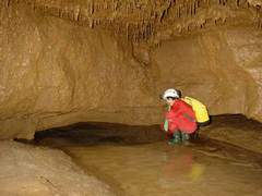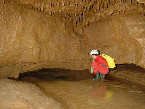 « Au niveau de la mise à l'eau, à la base d'une coulée stalagmitique active (juste après le laminoir), un plan d'eau oblong s'étire sur toute la largeur de la galerie. Au moindre mouvement le limon se soulève et diminue considérablement la visibilité.