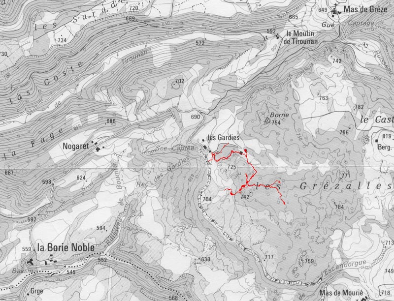 A une dizaine de kilomètres au nord-ouest de LODEVE, les Monts de l'ESCANDORGUE sont rattachés directement au LARZAC MERIDIONAL. La structure géologique d'époque jurassique est la même que pour ce dernier, hormis quelques coulées et cheminées basaltiques beaucoup plus récentes, démontrant l'existence d'une ancienne activité volcanique. Très semblable à la célèbre Rivière souterraine de LABEIL, aménagée depuis maintenant une dizaine d'années, celle des GARDIES se développe elle aussi à quelques dizaines de mètres seulement de la surface du plateau. Leur débit qui varie peu au long de l'année n'est que de quelques litres par minutes. La rivière souterraine (nous devrions dire Ruisseau) de la Grotte des GARDIES alimente en eau potable la population de la Communauté de l'ARCHE répartie sur les hameaux de NOGARET et la BORIE-NOBLE.