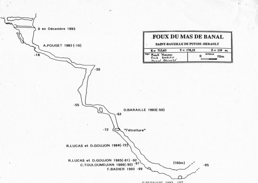 Au cours d'un camp organisé par l'association CELADON (26 29/12/1993) regroupant six plongeurs, alors que le niveau des eaux est supérieur de llm à celui d'étiage, Frédéric BADIER dépasse le terminus précédent pour toucher les -99m, côte portée à -103m le lendemain par Pascal BERNABE.