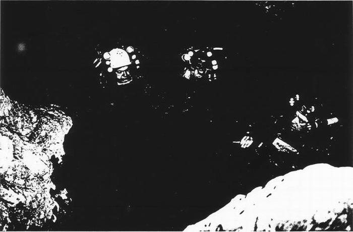 Pascal, Gilles et Frank: dernières recommandations avant le départ pour l'exploration de pointe. (Photographie: Claude VIALA).