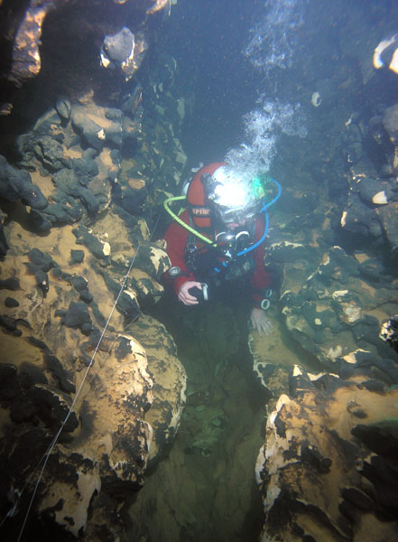 La vasque du S.2 plonge verticalement à –3, puis régulièrement jusqu'à -24m. (direction S.E). A –21, une modeste galerie s'engage en rive gauche jusqu'à un cul de sac à –14. Dans ce premier tronçon, la visibilité est parfois moyenne (par rapport à l'eau cristalline du premier siphon et de la seconde partie du S.2). A –22, après une remontée ponctuelle, un tronçon plus étroit augure une belle fracture dans laquelle on coule de -30 à -46m en retrouvant la direction Nord. Une vingtaine de mètres à la profondeur maximale conduit à la diaclase remontante qui s'élargit jusqu'à -27m, jusqu'à pincement impénétrable. Une courte galerie en rive gauche rejoint le sommet d'une fracture par laquelle on accède à la suite de la cavité.
