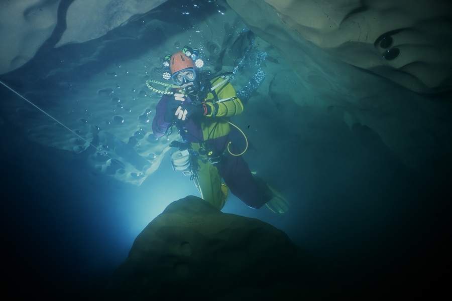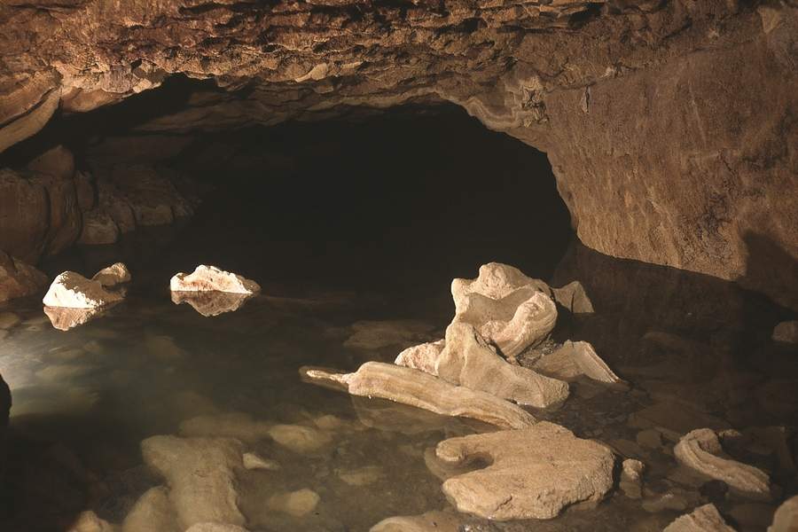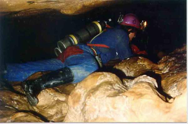 30m de laminoir facile où il faut progresser en rampant enchaînent avec 120m de galerie plus spacieuse au terme de laquelle on trouve la vasque d'entrée du siphon dont le niveau varie sensiblement.