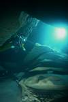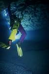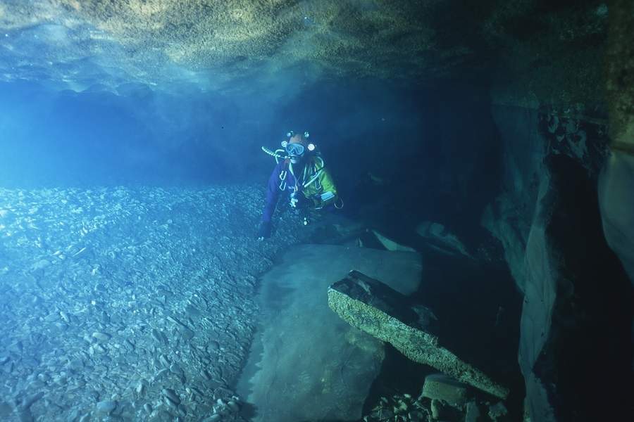 A 280m environ, on retrouve une zone chaotique où l'eau peut se troubler par endroits. Le terminus actuel (320m de l'entrée;-17m) est matérialisé par une trémie de gros blocs, malheureusement impénétrable.