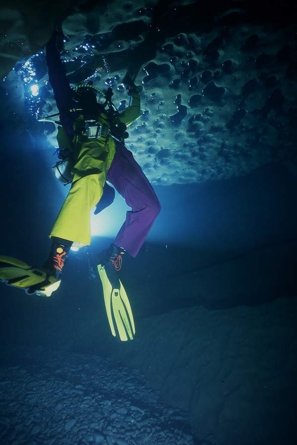 Les 100 premiers mètres du siphon s'effectuent dans une galerie aux dimensions agréables (l=4m;h=1,5m), puis il faut franchir une étroiture descendante sur un lit de graviers (une flèche gravée sur la paroi indique le passage le plus large), pour rejoindre le conduit principal aux dimensions plus modestes (3x1m).