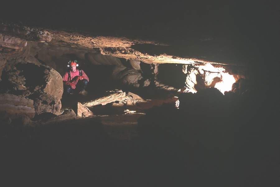 En effet, la hauteur du conduit diminue encore, le sol est jonché de blocs, la progression est pénible.