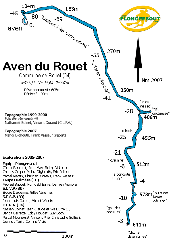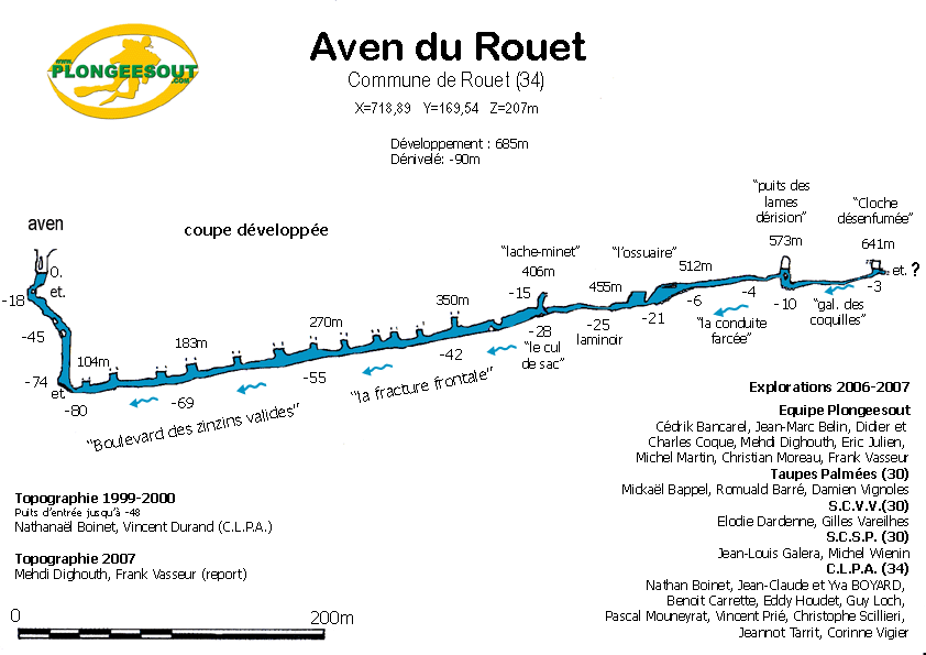 Entre 1997 et 1999, Nathanaël Boinet et Vincent Durand (CLPA) entreprennent l'équipement du puits (aménagements extérieurs, échelles, dalle béton au niveau, équipement en câble et corde avec spits jusqu'à -42) avec une topo du puits jusqu'à -73 m. Au début des années 2000, un plongeur francilien aurait franchi l'étroiture de –76 et aurait progressé d'une dizaine de mètres au-delà. En décembre 2005, deux membres de l'équipe Plongeesout revisitent la base du puit. Ils entrevoient une continuation derrière une étroiture constituée d'un talus de blocs roulés partiellement accolés à la voûte. Durant les années 2006-2007, l'équipe Plongéesout, soutenue en surface par le CLPA, organise un campagne d'explorations qui les conduit à émerger à 641m de l'entrée, dans une fracture sans suite évidente. Une topographie intégrale est levée. Des prélèvements de sables révèlent la présence de mollusques vivants à –74. Une couverture photographique est menée jusqu'à la limite du matériel photographique disponible (-45). Des os et des armes sont retrouvées en divers points de la cavité. Diverses formes de vie sont identifiées (crustacés, mollusques, vers, poissons).