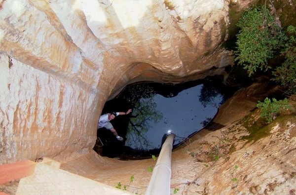 L'entrée circulaire est aussi imposante par ses dimensions (6x4m) que pour son esthétique. Elle donne directement sur le plan d'eau calme situé au pied de la verticale (-10m en période d'étiage). Une ambiance de « cenote » émane de ce puits naturel. L'eau, si rare de la surface, semble à portée de main, de seau, de pompe, de palmes.