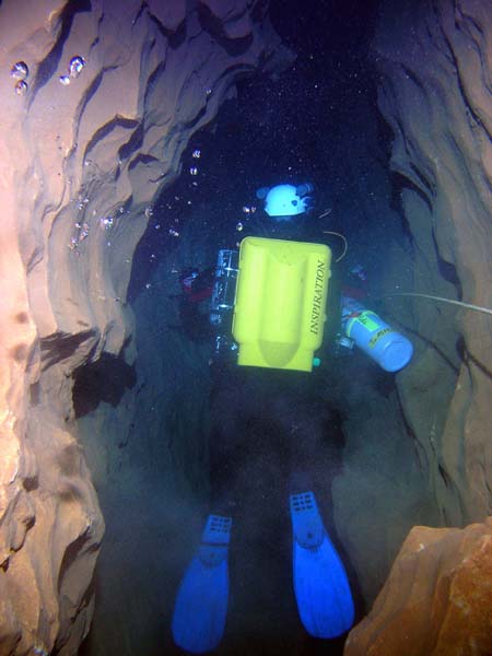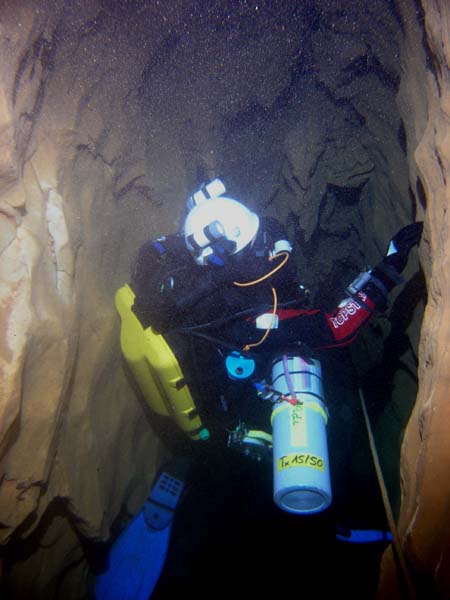 La visibilité se dégrade très rapidement dans ce siphon. En circuit ouvert, les paliers se déroulent dans une ambiance "chargée", avec moins d'un mètre de visibilité.