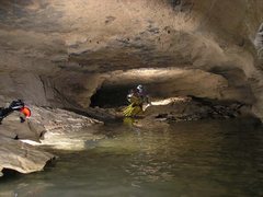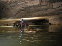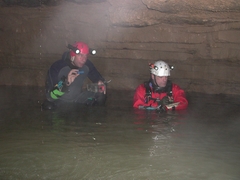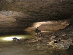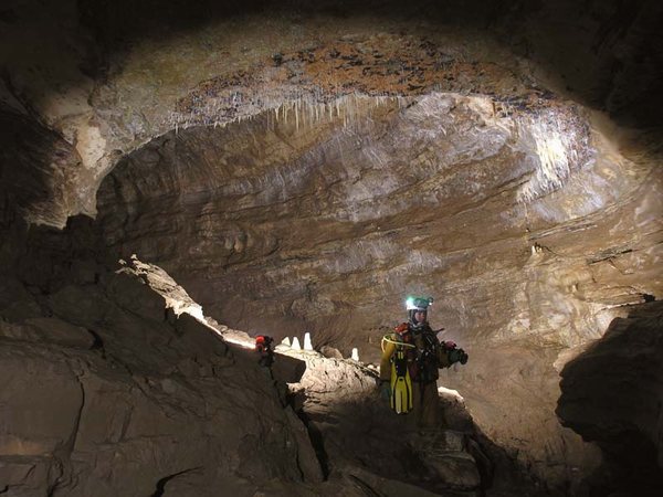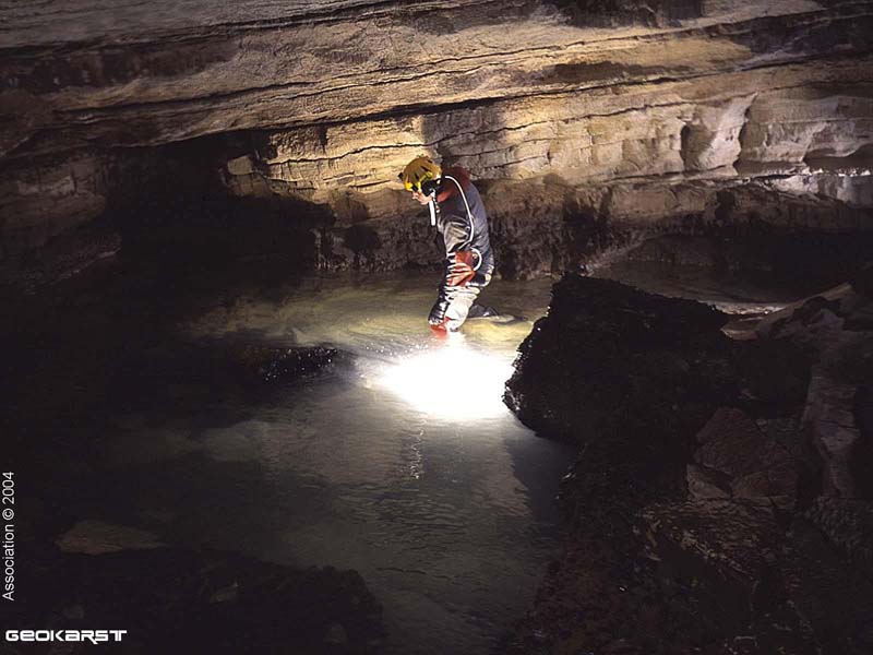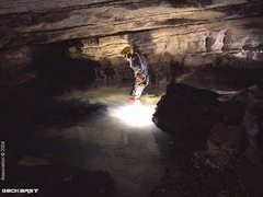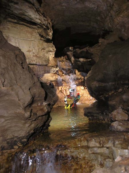 On y remonte de 35m jusqu’au point haut, avant de redescendre sur la rivière. Rapidement, une cascade, dont le déversoir s’étale sur 3m, précède une voûte mouillante. Derrière, la galerie retrouve des dimensions plus humaines (3 x 6m) et se pare de concrétions. De nombreux affluents rejoignent l’écoulement principal. On évolue ensuite dans un méandre où il est nécessaire à deux reprises de s’élever en opposition au-dessus de la rivière pour trouver un passage humainement pénétrable.