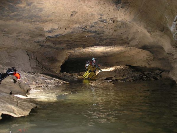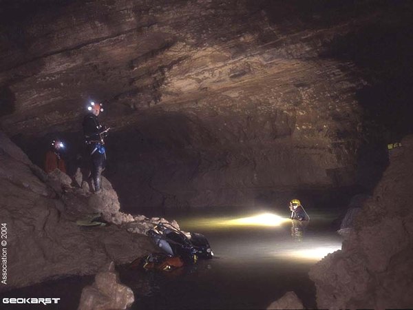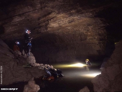 - un affluent en rive droite remonte durant 240m, puis deux voûtes mouillantes précèdent le S.5 (515m;-30). Il débute par une succession de salles dunées argileuses ponctuées de passages bas, puis passé un point bas (-27) remonte graduellement à -12. Le conduit plus modeste plonge à -30 suite à une étroiture dans l'argile et vient buter, au terme d'un laminoir, sur une étroiture entre le plafond et des blocs au sol. Passé ce rétrécissement, on débouche alors dans un vaste volume noyé qui émerge dans une immense salle (12 x 20m). Une escalade de 2m rejoint un puissant chaos concrétionné sur lequel l’eau ruisselle de gour en gour.