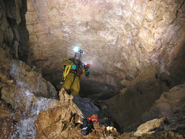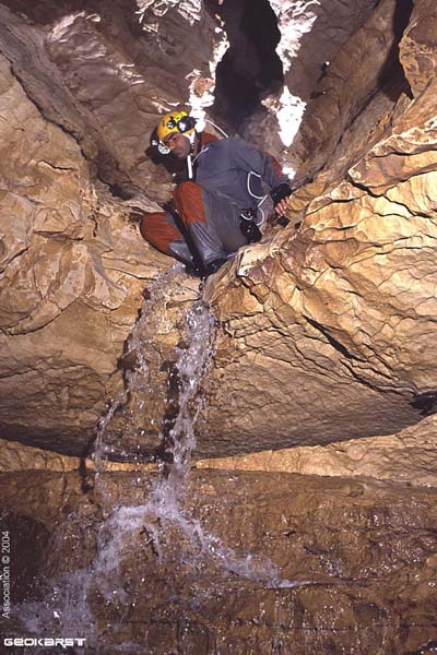 Le conduit principal est remonté en compagnie de Frédo POGGIA sur 1250m jusqu'à une cascade de 20m, alors qu'en sortie du S.4, un diverticule