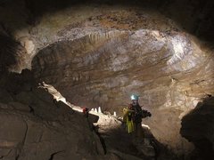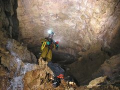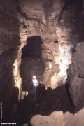 - le conduit actif se prolonge par ressauts ascendants sur 1250m (passage surbaissé à franchir sous trémie) jusqu'à une escalade, précédée d'une salle (10m de diamètre), évaluée à 20m. De nombreux départs de galeries restent à explorer.