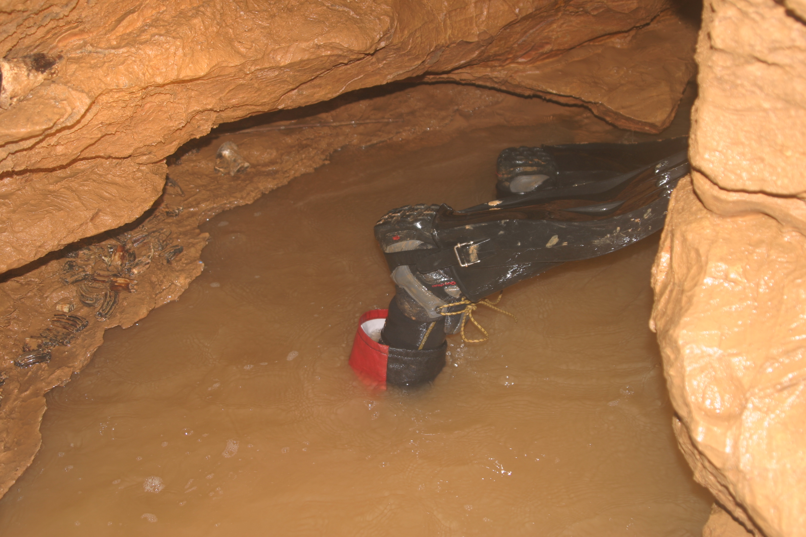 Et c’est parti pour 60m de ramping, avec des passages cotons, armés de nos kits. Enfin, nous arrivons au siphon dont les margelles sont couvertes de dents d’herbivores plantées dans l’argile. Les préparatifs commencent malgré l’espace très réduit qu’offre la galerie. Après quelques photos de Christian, je mets en route ma caméra et c’est presque parti.
