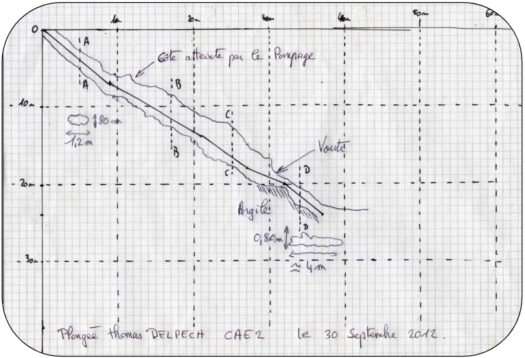 A -20m, le sol devient une couche épaisse et onctueuse d’argile. Le plafond se rabaisse franchement et à -24m je stoppe car je suis dans un passage relativement bas avec un fort pendage. Je ne connais pas la nature des parois, roche ou talus d’argile déposée, en plus je n’y vois plus rien. La galerie continu sa course vers le bas mais avec une inflexion moindre. Douze minutes d’écoulées. Je sors en enroulant du fil jusqu’à un amarrage. Je coupe et sors. La topographie que j’ai prise à l’aller est bien en sécurité sur ma tablette. Débriefing rapide, puis rangement et direction la sortie.