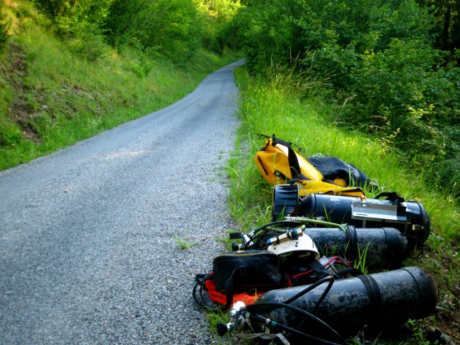 L'entrée de la galerie est assez intime. Ca passe avec un petit bi dorsal mais le mieux est de plonger avec les blocs en latéral. Elle descend sur une pente de cailloux pour partir à l'horizontale et déboucher ensuite après quelques mètres sur une belle galerie. La direction générale est sud. Le premier siphon tournicote quelque peu, il monte et il descend.