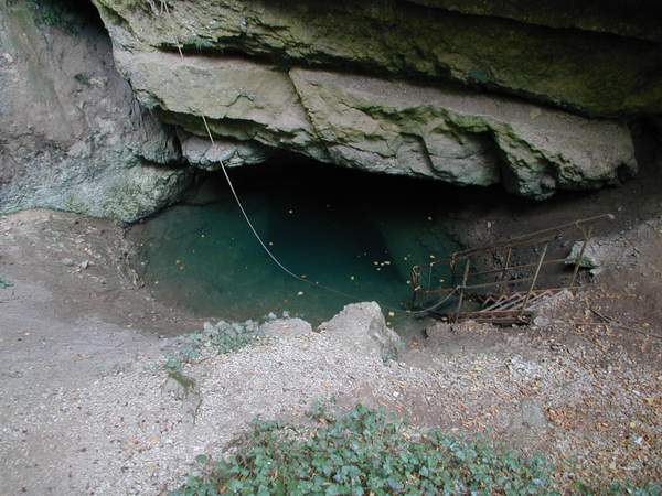 La zone d'effondrement forme un petit cirque de 15 m. de diamètre. Au fond, sous un petit surplomb, s'ouvre un entonnoir (longueur 8 m., largeur 6 m.). Un talus en forte pente mène 3 m. plus bas à la vasque. Il est composé de gros cailloux et de graviers soudés par une terre arg-leuse. La hauteur du plend d'eau (6 m. de long, 2,5 m. de large), varie suivant les saisons.