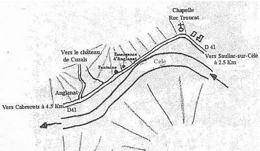 Situation De Sauliac (3km) à Cabreret (5km), sur la rive droite du Célé par la route D41 , se trouve l'émergence d'Anglanat, 300m après la capelle de Roc Troucat et 80m avant la petite fontaine qui porte le même nom. Pour s'y rendre, monter par le petit sentier ou au milieu des buis jusqu'à la fissure à 7m au dessus de la route. Exutoire de crue en falaise, c'est probablement le trop-plein de la fontaine du même nom à quelques mètres de la route.