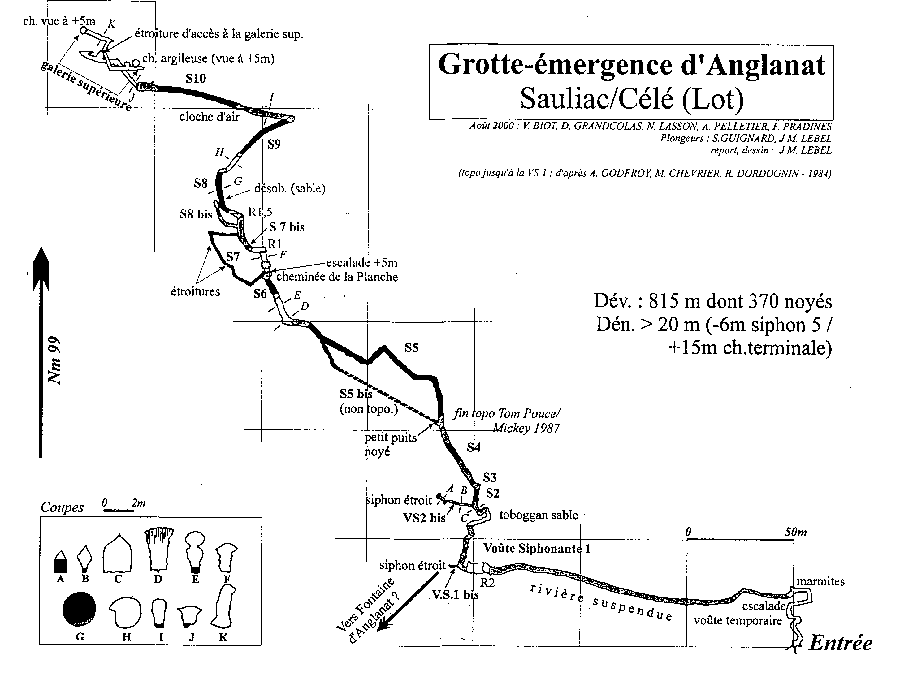 Les deux cent premiers mètres sont connus de longue date. En 1977, le Groupe Spéléo de Corrèze progresse jusqu'à trente mètres dans le troisième siphon. Description Les deux cent premiers mètres (la rivière suspendue) sont une succession de gours formant une retenue d'eau. Un ressaut livre l'accès à la zone siphonnante, terminée par une galerie exondée. Bibliographie |
