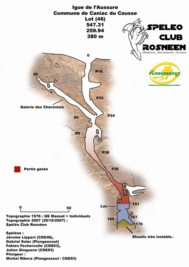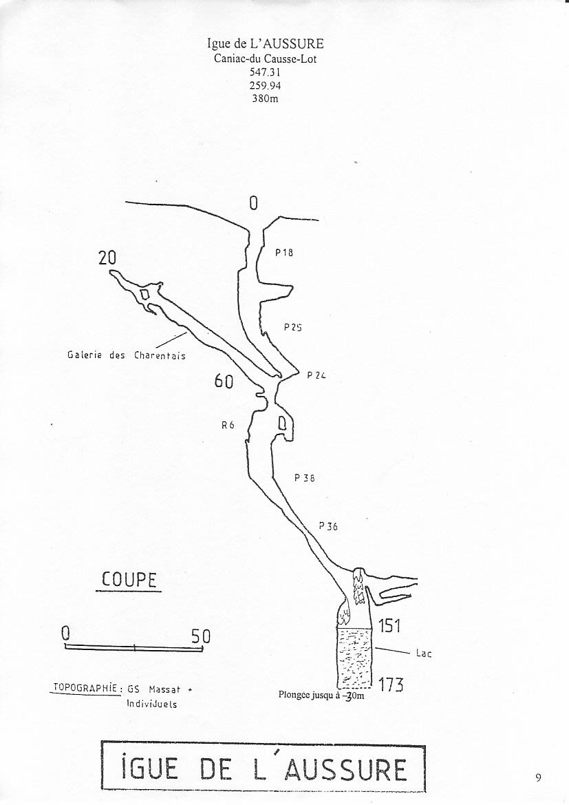 Situation Sur la D42, entre Caniac du Causse et Fontane du Causse. L'igue de l'Aussure se situe juste après Planagrèze, un chemin en terre est parallèle au chemin d'accès de Planagrèze. Au bout du chemin, la suite se fait à pied, passez la barrière, et on suit un petit chemin indiqué par des cailloux (environ 300m). Descriptif L'igue s'ouvre sur une petite doline, la cavité descend en une succession de puits de forme hélicoïdale assez joli. De magnifiques draperies, usées par le passage, cache une multitude d'animaux et d'insectes cavernicoles. Arrivé dans la zone des -150 m , un lac apparaît, il est surmonté de deux énormes coulées de calcite. Compte Rendu par Michel RIBERA Spéléo Club Rosnéen / Plongeesout Le Samedi 20/10/2007 avec Gaby, nous sommes allé plonger à l'Igue de l'Aussure pour une reconnaissance et récupéré un kit qu'une équipe de notre CDS avait perdu en avril 2007. Comme toujours Gaby et Jérome étaient présents avec leur bonne humeur, malgré les 45 minutes de retard que j'avais, un parisien sans GPS, c'est vite perdu... C'est au milieu d'une battue de chasse que nous sommes rentrés dans le trou, une bonne partie du fond était gazée. Je pense que cela est du à la décomposition des feuilles, et il n'a pas plus depuis un bon moment, car en avril la cavité étais ok... Cette igue est pleine de vie surtout en automne. Maître Gaby avait préparé une plateforme (modèle réduit de Planagrèze), ce qui ne fut pas du luxe...