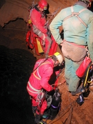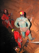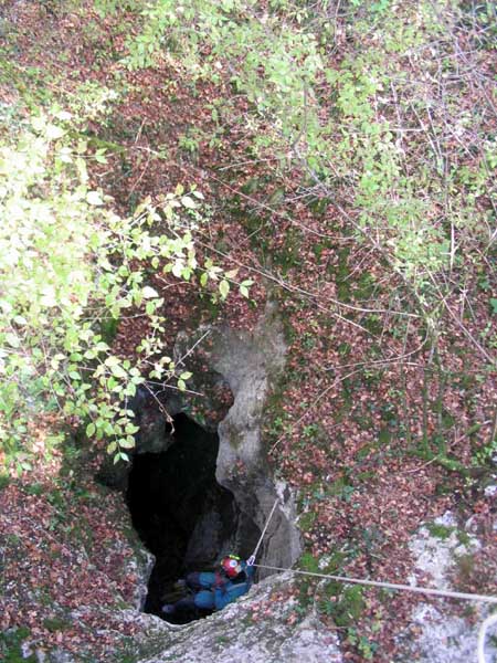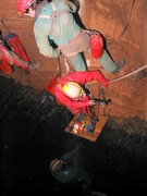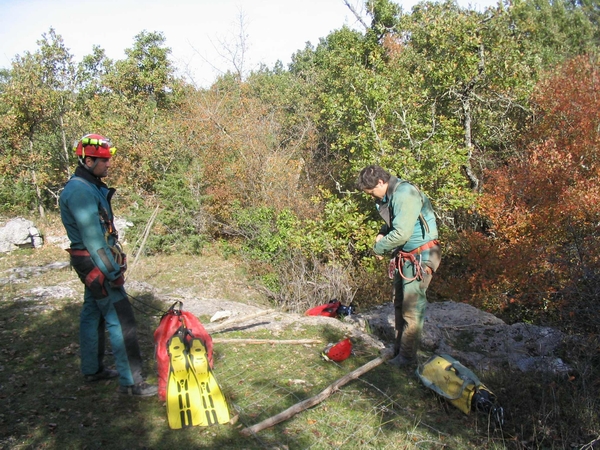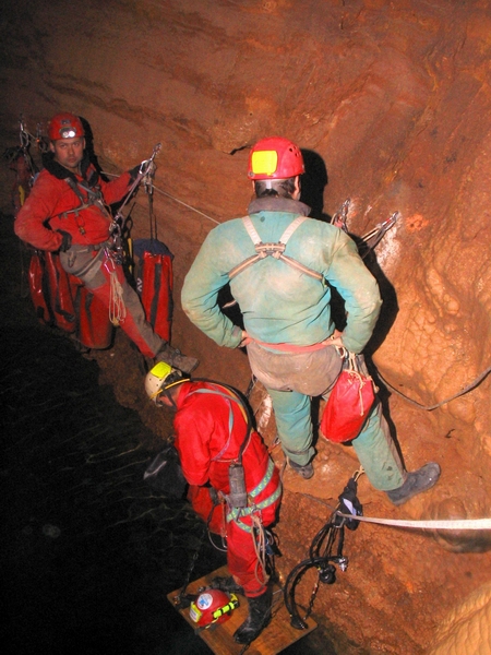 Bref après la mise à l'eau, la cavité ne descend pas droit comme l'indiquait l'ancienne topo, et deux gros balcon font leur apparition dans la zone des 5 mètres . Arrivé dans la zone des 18 mètres , on trouve un éboulis très instable (les restes de chutes de pierres et de matos des spéléo notamment le pantin de Gaby, la relique du pantin).