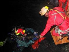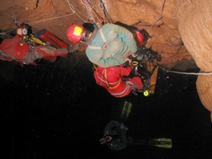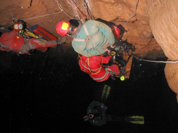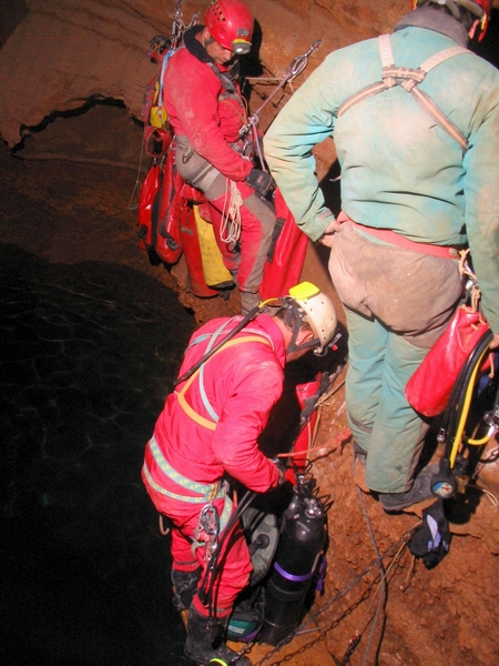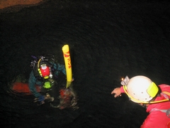 Bref le temps, d'y voir plus clair, je fais le tour de l'éboulis, ce dernier est entouré par une large bande d'argile (entre 15 et 30 cm ). Je retrouve le kit, que j'envoie à la surface avec un parachute et oui, désolé la plongée mer oblige... Je continue l'exploration, je fais le tour et rien n'indique une continuité… Je décide donc de remonter mais auparavant, je met la mais dans la bande d'argile pour connaître la profondeur, je mis enfonce jusqu'au coude. Je sent quelques choses, tiens un Kway, tiens deux os, tiens une masse métallique (une gueuse de sondage), bref un énorme merdier.... En remontant, j'aperçois le kit de matos bloquer dans une voûte et là dans la zone des -16, je vois un méandre assez étroit ( -60 cm ) qui remonte. Le passage est assez serré, anglaise oblige… Mais, c'est juste une cloche. Je reprends le kit et fin de plongée... La remontée, pour ma part, se fait lentement à cause du gaz et d'un kit assez lourd... (Fais chier d'être aussi gros...). De retour en surface, l'objectif était rempli, récupéré le kit, et plongée dans ce lac qui me narguait depuis belles lurettes…. Je tiens à remercier tout ceux qui m'on permis d'effectuer cette plongée :