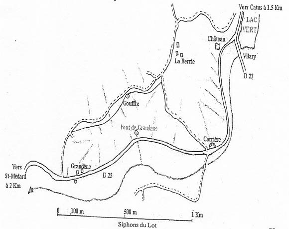 Situation Du lac vert situé à 1,5km de Catus, prendre la direction de St Médard, D5. Font de Graudène se trouve à 1,3km du lac vert, en rive droite. Pour accéder au gouffre de la Berrie, continuer sur 600m environ, puis prendre le chemin sur la droite peu après le lieu-dit : Graudène. Description |