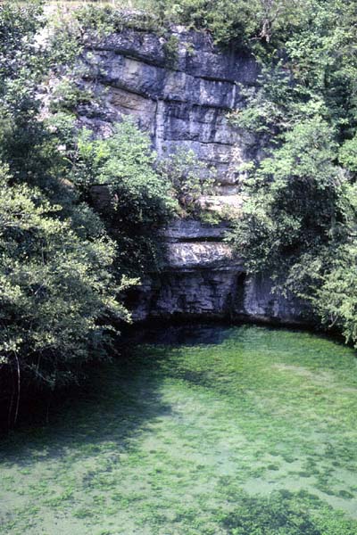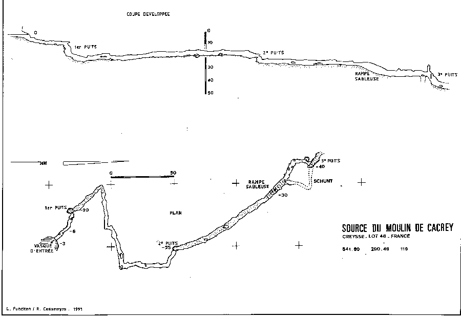 A partir de la mare pittoresque du moulin, on trouve, à 6m de profondeur, une galerie de 3 mètres de diamètre qui donne sur un puits à -18 mètres. (remarquez qu'il y a un autre puit plus petit à la base du puit principal). Le bas du puit se poursuit par une galerie sculptée de 160 mètres à une profondeur de -16m à -18m. On arrive au sommet d'un second puit qui descend de -17 mètres à -24 mètres. Le passage s'élargit pendant 140 mètre vers deux marches qui amènent à -32 mètres. A partir de là, la galerie descend en pente douce jusqu'à -48 mètres. Recommandations