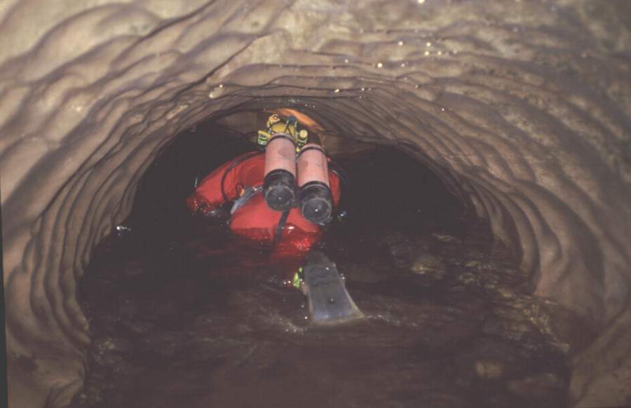 Ensuite, 20m de grenouillage, S.6 (30m ;-1) et 970m d'exondé dans lequel une partie fossile permet de contourner une zone siphonnante, puis S.7 (180m ;-8) et 20m de galerie (terminale).