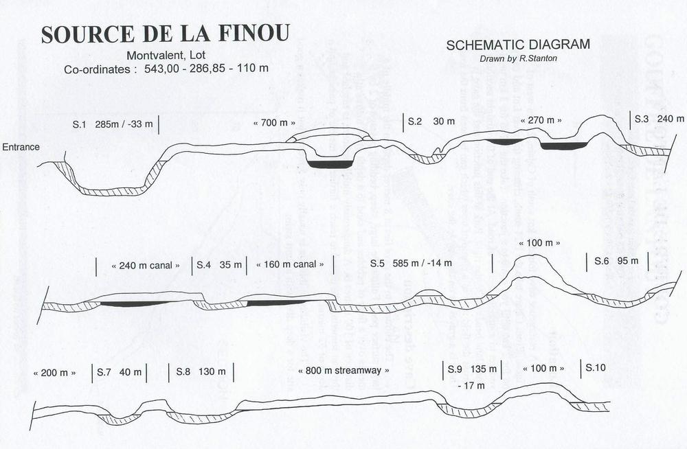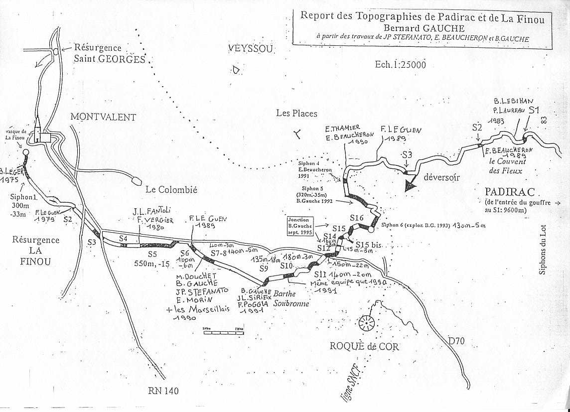 Le siphon n°1 descend sur une pente de galets instables. A la profondeur de -30 mètres le passage se stabilise. La galerie est large et la profondeur atteint tranquillement -33 mètres. Elle continue sur 150 mètres et passe par un trou de hibou avant de remonter par un petit puit sur une courte distance. On rejoins la surface à 285 mètres du départ. Il faut marcher 700 mètres dans une large galerie avant d'atteindre le siphon n°2. Escalader la paroie evite de se trimbaler une échelle pour atteindre ce deuxième siphon. Le siphon n°2 fait 6 mètres de long. Au terminus de ce siphon, une corde permet de descendre dans une galerie boueuse qui mène au siphon n°3. Au total, il y a 22 siphons